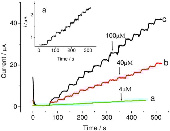 Typical steady-state response of the sensor with an increasing H2O2 concentration of 4×10-6 M (a and inset A), 4×10-5 M (b) and 1×10-4 M (c) for each step at –0.4 V