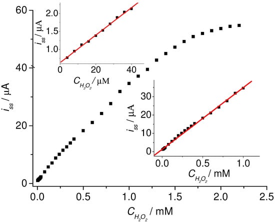 Calibration curve of HRP-Au-SPCE for successive addition of H2O2 in 0.1 M pH 7.0 PBS. Insets: linear calibration curves.