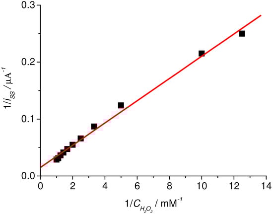 When the concentration of H2O2 was higher than 1.0 mM, a response platform was observed, showing a characteristic of the Michaelis-Menten kinetic mechanism. The apparent Michaelis-Menten constant (KMapp), which gave an indication of the enzyme-substrate kinetics, could be obtained from the electrochemical version of the Lineweaver-Burk equation []. The KMapp was determined by analysis of the slope and intercept of the plot of the reciprocals of the steady-state current versus H2O2 concentration (Fig. 8). The KMapp value of the HRP-Au-SCPE was 1.3±0.3 mM, which was lower than those of 4.8 mM at HRP-CPE [], 4.6 mM at PB-SPCE [] and 2.3 mM at HRP/Au colloid self-assemble monolayer electrode []. Thus, the sensor had a higher affinity to H2O2.