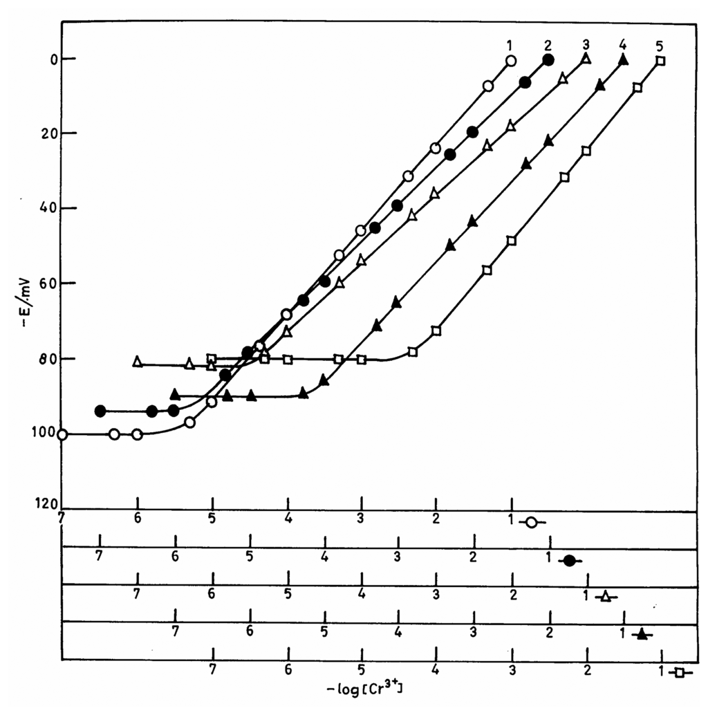 The membrane was equilibrated with 1.0 mol L-1 chromium(III) chloride solution for three days. The potentials generated after three days were stable and reproducible. The working concentration ranges and slopes for all the five membranes are given in Table 2. It was observed that the membrane No. 2 with polystyrene and ionophore, dibutylphthalate (plasticizer) and sodium tetraphenylborate (anion excluder) in 1:4:1:1 ratio (w/w) had the widest concentration range of 1.6×10 6-1.0×101 mol L-1 and a near-Nernstian slope of 19.5 mV/decade. Membrane No. 1 with ionophore and polystyrene in 2:1 ratio (w/w) showed a non-Nernstian slope of 22.5 mV/decade of concentration. Similarly, when the polystyrene ratio was decreased, the response was also non-Nernstian and the working concentration range becomes poorer (3.2×10-6 -1.0×10-1 mol L-1 for membrane No. 3, 7.1×10-6 -1.0×10-1 mol L-1 for membrane No. 4 and 5.0×10-5-1.0×10-1mol L-1 for membrane No. 5, see also Fig 1). Hence, the membrane No. 2 was studied in detail as a Cr(III)-selective electrode and all further investigations were carried out with this particular membrane.
