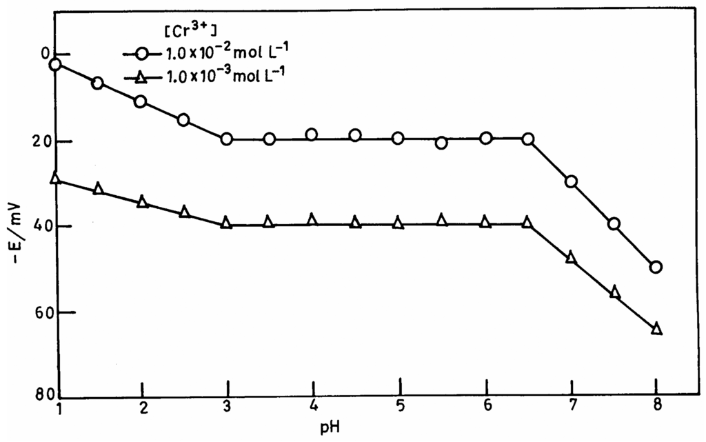 The pH dependence of electrode potential was tested over a pH range 1.0-8.0 for 1.0×10-2 mol L-1 and 1.0×10-3 mol L-1 of Cr3+. The pH was adjusted with nitric acid or ammonia solution. The potential was independent in the range 3.0-6.5 (Figure 2) and the same can be taken as the working pH range of the electrode assembly. The change in potentials above pH 6.5 may be due to the hydrolysis of Cr3+ and below 3.0 due to a H+ ion interference.