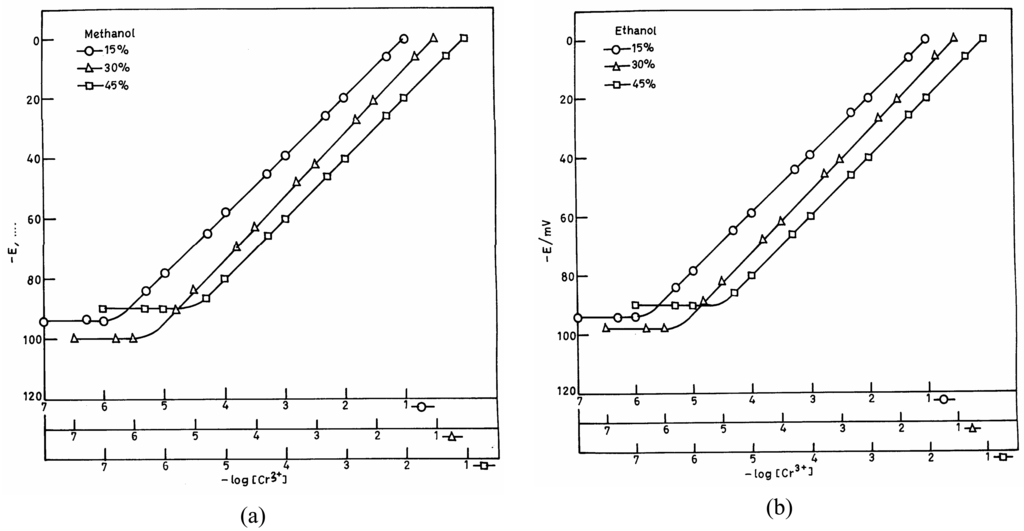 Plots of potential vs. log [Cr(III)] of mixed solutions: (a) water-methanol and (b) water-ethanol.