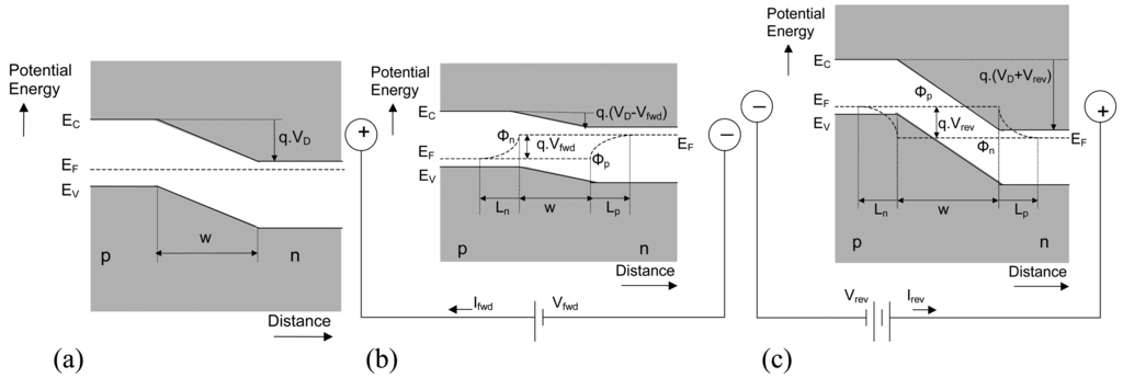 Quasi-equilibrium approximation and the potential energy band diagram as a function of distance for the case of a p-n junction (a) without externally applied bias, (b) under forward bias Vfwd, and (c) under reverse bias Vrev. Symbol list: Ec is the bottom of the conduction band, Ev is the top of the valence band, Φn and Φp are the quasi-Fermi levels for electrons and holes, EF is the Fermi level at thermodynamic equilibrium, Ln and Lp are the minority carrier diffusion lengths for electrons and holes, VD is the diffusion potential, w is the depletion layer width, q is the electronic charge and VTOTAL is the junction total potential due to the applied bias (after []).