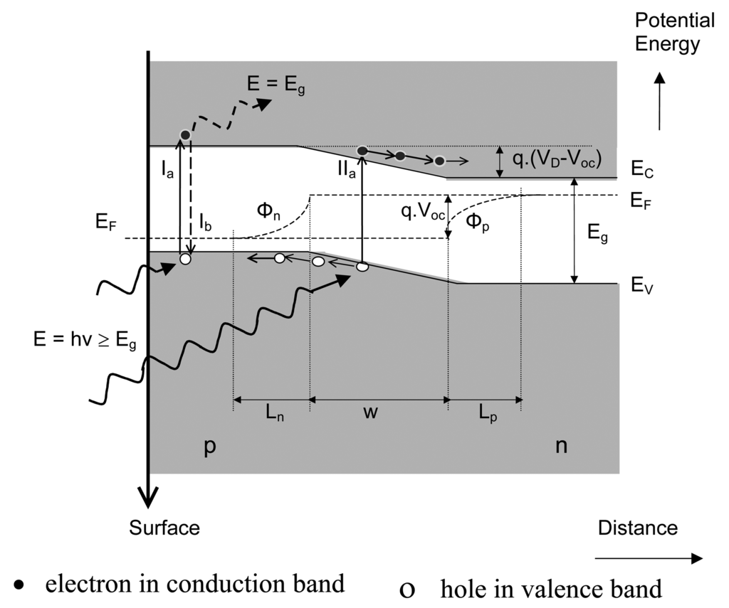 The produced electron-hole pairs within the depletion layer width or within the minority carrier diffusion lengths at either side of the junction (process IIa) separated by the build-in electrostatic potential, as shown by the small arrows for electrons in the conduction band and holes in the valence band. On the other hand, the electron-hole pairs induced by absorbed photons outside the aforesaid region (process Ia) will not be separated by the electrostatic field and once, the carriers lifetime has elapsed, they will recombine spontaneously, emitting photons having a total energy equal to the energy gap, Eg (process Ib).
