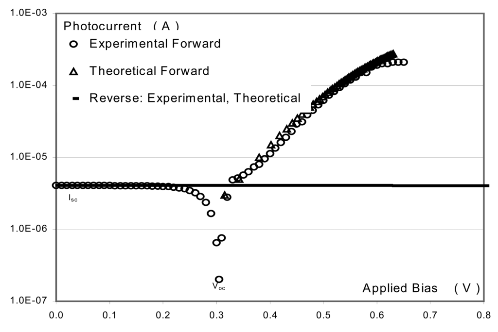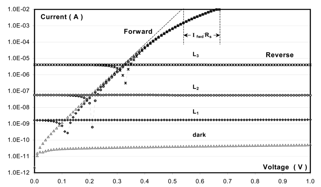 According to the superposition principle, in the generalized case of a simultaneous electrical and optical excitation, the quasi-Fermi levels will split by the amount q.VTOTAL, where VTOTAL = (Voc+Vfwd) or, VTOTAL = (Voc-Vrev) for the forward and reverse bias, respectively. Based on the “quasi-equilibrium” approximation, it can be shown that the analytical expressions for the current-voltage characteristics in any illuminated p-n junction will be given by [,]: