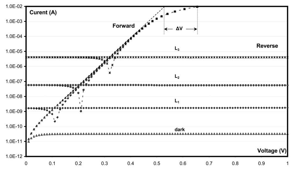 Under forward bias (Eqn. 2), the photocurrent component affects the overall current-voltage characteristics only in the voltage range between 0 < Vfwd ≤ Voc, where the photocurrent component is greater by orders of magnitude compared to the current component attributed to the applied forward polarity. At Vfwd = Voc the two component equity situation is reached, i.e. Ifwd = 0. Thus, the device open-circuit voltage at each illumination level can be identified by the corresponding forward voltage values, where the total current reduces - by orders of magnitude - towards zero values. Note that as predicted by Eqn. (3), for forward polarities in the range of 0 < Vfwd ≤ Voc, the net current has a negative sign, therefore the device produces power. At higher applied forward voltages, the exponential current component dominates and the I-V characteristics appear as straight lines. In this voltage regime, the slope of the logI-V curve allows for the ideality factor (η) the evaluation []. Generally, η is a positive number greater than unity, and has to be smaller than 1.06 to ensure for the validity of the quasi-equilibrium model approximation. In other cases, an additional (competitive) charge transport mechanisms may also take place across the potential barrier of the junction. For forward current values greater than approximately 2.10-4 A, the observed saturation effect for the examined devices is mainly attributed to the device embedded series resistance, Rs, and/or initiation of the high injection effects [].