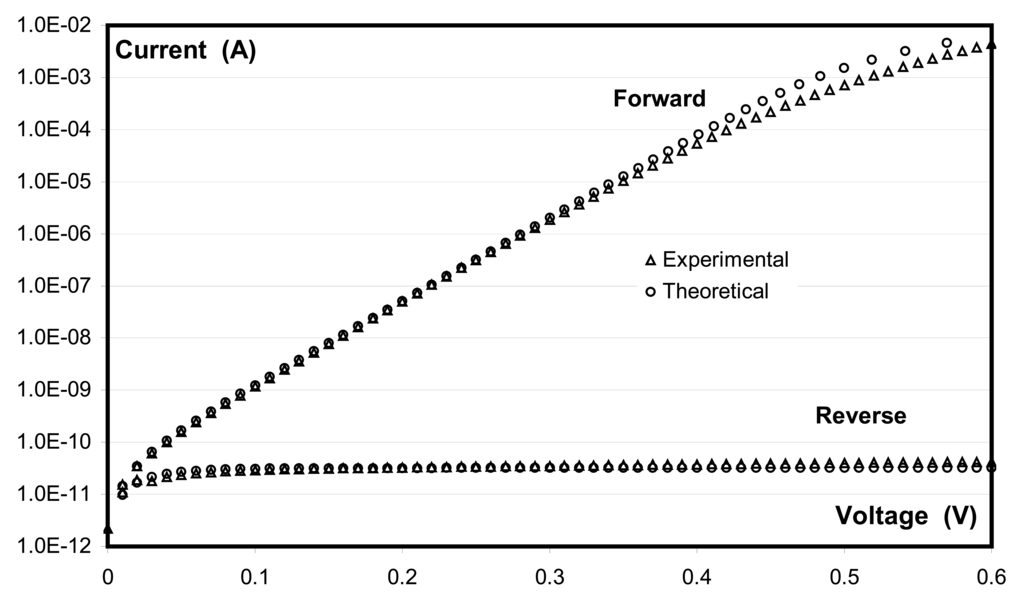 In a forward biased p-n junction, the recombination current density, Jrec, has been described by the Schockley-Read low level injection theory [], which after certain simplifying assumptions, provides for this additional current component an equation of the following form []: