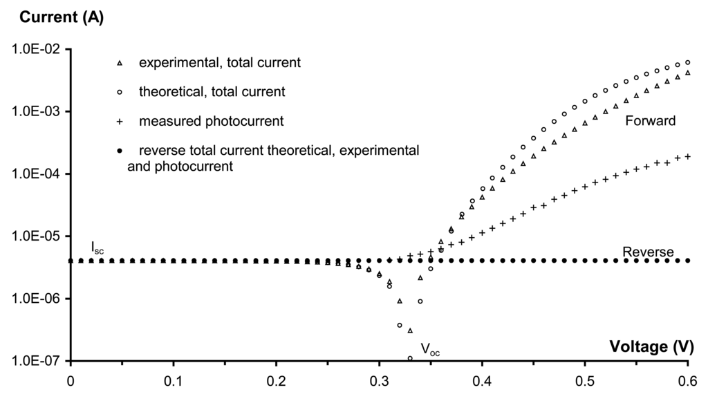 The current-voltage response of p-n junctions sustaining simultaneously optical and electrical excitation may be evaluated by comparing the experimentally attained data to the theoretically predicted response. Theoretical I-V curves can be obtained by applying Eqn. (10) and (11).