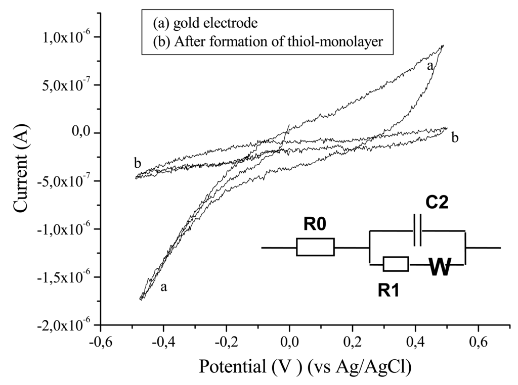 The impedance spectra of the crystal substrate before and after the deposition of the thiol monolayer are represented in Figure 2. The impedance spectra should be fitted using the model equivalent circuit presented in Figure 1. The capacitance C2 is the double layer capacitance of the gold/electrolyte interface, R1 is the charge transfer resistance in the low frequency range and Z(W) is the impedance due to the mass transfer of the redox species to the electrode described by Warburg. The resistance in the high frequency range R0 is the resistance of the electrolyte, the contacts and connections.
