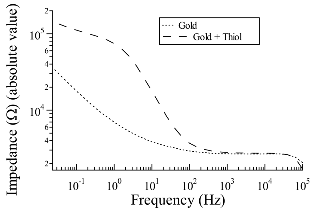 Impedance spectra of the crystal substrate before and after the deposition of the thiol monolayer.