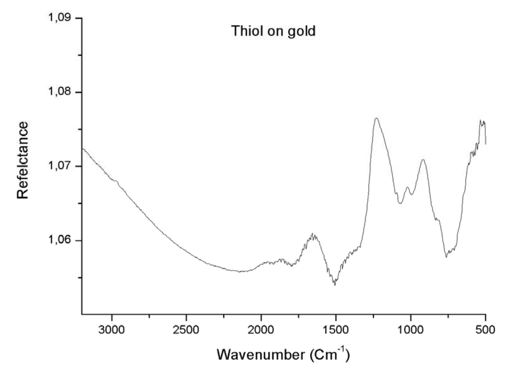 FTIR spectra were obtained with a Brucker IFS66V/S spectrometer equipped with MIR (Middle Infrared) source, DTGS detector and KBr separating mirror. All spectra were collected with 32 scans for the reference and the sample, with 4 cm-1 resolution in the reflection mode. This method is very simple; first the spectrum of the crystal substrate after the cleaning procedure is recorded as a reference and then, that of the crystal with thiol as a sample. The ratio of the second one and the first one gives the spectrum of the thiol monolayers on the modified crystal.