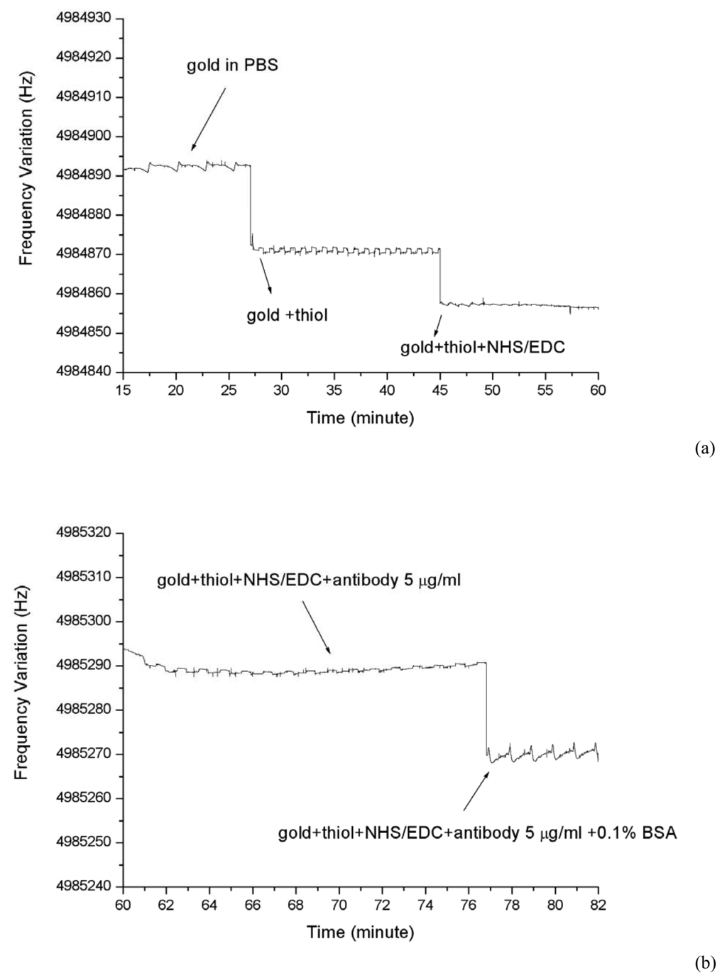 Figure. 4(a) shows the decrease of the resonance frequency of the quartz due to the adsorption of the thiol monolayer and NHS/EDC cross-linker. The adsorption of thiol induces a shift in the frequency of about 20 Hz, but for NHS/EDC the shift is about 15 Hz. The deposition of antibody was made without recording the frequency variation as it was avoided a variation in the frequency due to the difference in viscosity of the acetic/acetate buffer with the running buffer PBS. The adsorption of 0.1% BSA molecules induce a frequency shift of about 25 Hz, which is normal as these molecule are rather big (Figure 4(b)).