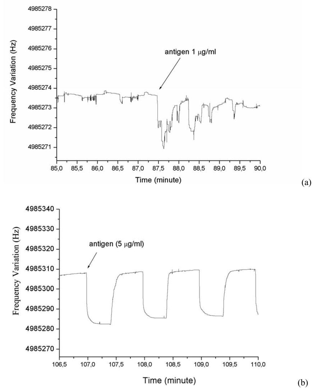 a) Frequency shift of the quartz for 1 μg/ml antigen. b) Frequency shift of the quartz for 5 μg/ml antigen.