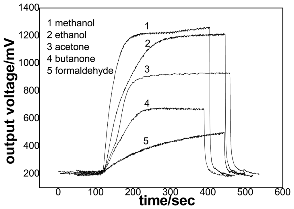 As shown in the figure, one could clearly observe that the resistance of the sensing element changes obviously upon exposure to the organic gas, meanwhile the response time could be observed audio-visually by means of the tendency of the static curves. It was also necessary to point out that, however, in addition to the changes in resistance and response time, there was no other information about reaction processes, so it was difficult to analyses the sensing mechanism for butanone, acetone, ethanol and methanol. Except the static response to formaldehyde, the other responses were similar to each other. In fact, there are two types of different functional groups (carbonyl group and hydroxyl group). There is no way to distinguish between the carbonyl and hydroxyl group because of the shortcoming concerning their lack of sufficient phenomenon. In a word, during static measurements, only the resistance changes of the sensing element in initial and final state were observed, as for the other changes during reaction processes no other information was obtained.