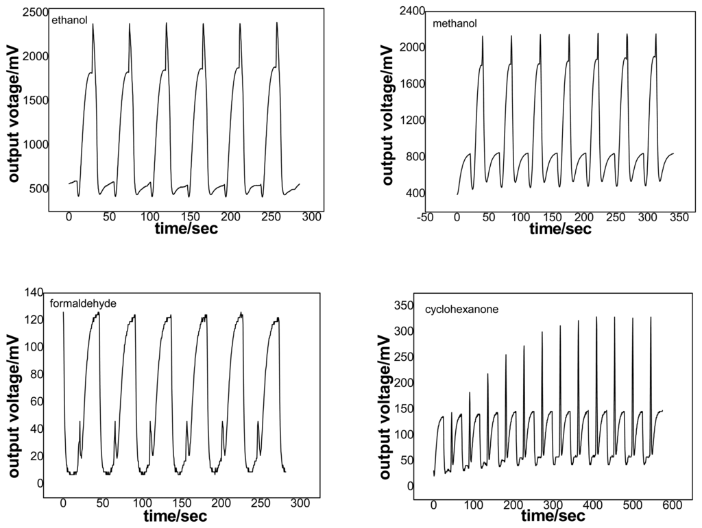 Firstly, as seen in Fig. 3, it was worth to note that there was sufficient reaction information in the dynamic nonlinear responses, so the sample gases could be easily identified by means of different nonlinear responses. In the four selected species, there are three types of different functional groups (hydroxyl group, aldehyde group and ring ketone); one could easily obtain the distinguishing and connection among the testing species by comparison the static responses. In the case of the dynamic responses to ethanol and methanol, because of their identical hydroxyl group, there is a similar tendency in the curves.