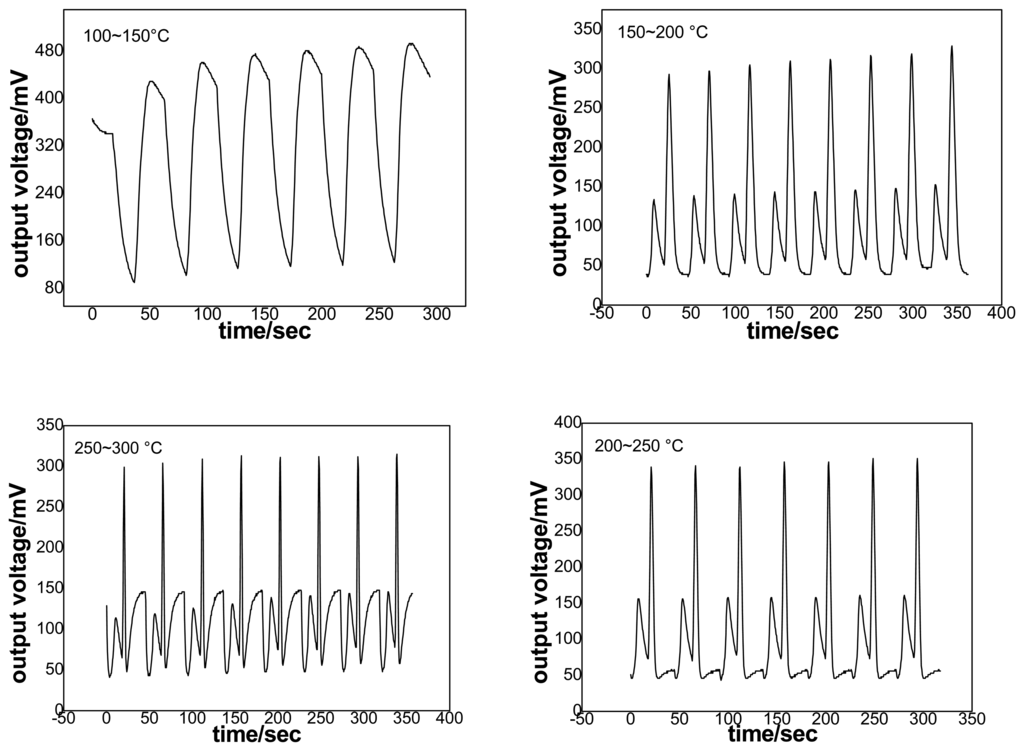 Thirdly, it was also found that the operation temperature during the dynamic processes was lower than that of the static processes. For example, the static operation temperature using an applied potential of 7 V reaches 450 °C, whereas the dynamic temperature at operation frequency of 20 mHz was in the range of 300∼210 °C.Therefore, we suggested that a modulated temperature operation mode not only enhances the selectivity of a gas sensor but also reduces the overall power consumption.