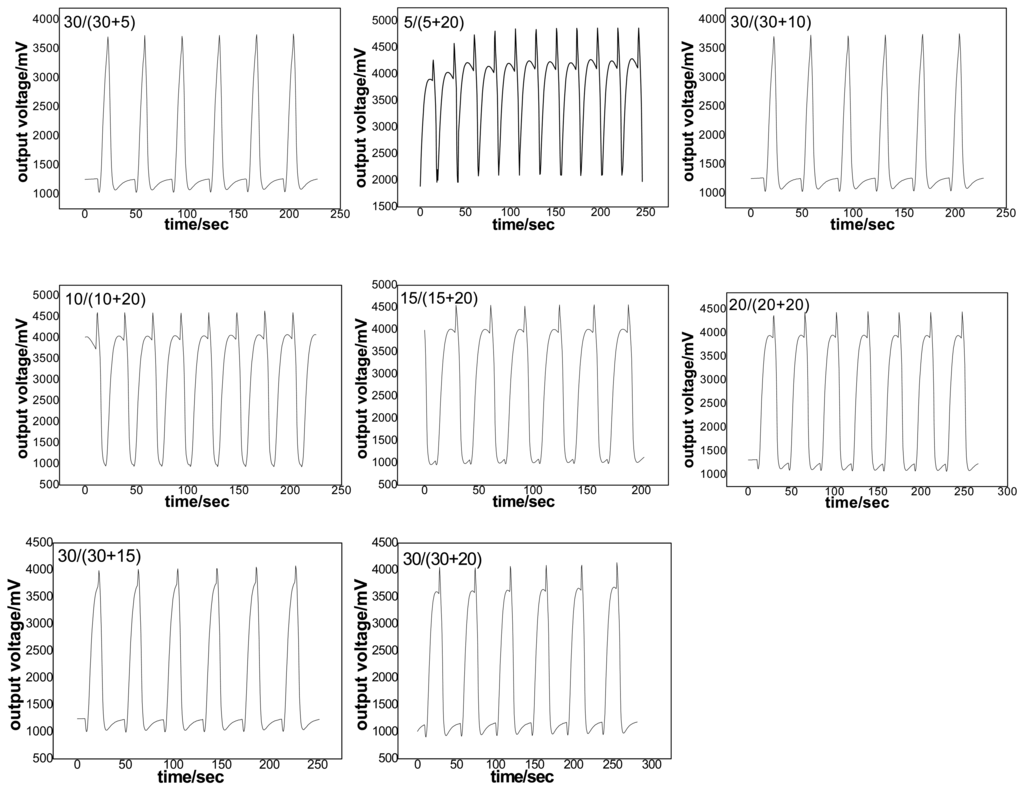 Fig. 5 clearly shows the time-dependent change shape of the resistance of the sensor in the presence of butanone in air at different duty ratios by controlling an applied potential of 7 V in a rectangular mode. As seen in the figure, one can easily observe the effects of electrical outage and switch-on on the dynamic responses. In the left part of the figure, the lower half of the response was influenced evidently by the state of switch-on electrical current. With the lengthening of the switch-on time (electrical outage time in thermal cycle), the response was appeared gradually. Inversely, the upper half of the response was influenced obviously by the state of electrical outage; the more the time of the electrical outage, the more evident the upper half of the response. Therefore, the duty ratio was beneficial to investigate the sensing mechanism, and it was in agreement with the analysis in the dynamic nonlinear response.