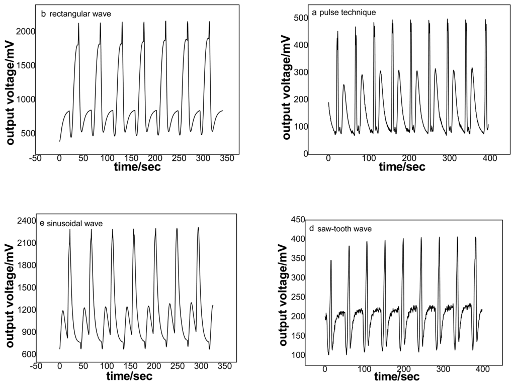 In order to improve the detection, the modulation of the wave shape was carried out. The dynamic nonlinear responses to methanol are reported in Fig. 6 using different modulation waveforms. Although the object was commentarial, one could see that the nonlinear responses were different to each other. These experimental data are in agreement with A. Ortega's report. A. Ortega and his co-workers have reported that CO and CH4 could be detected by using pulse and triangular heating waveforms []. According to the analysis of the sections above, the change of the heating shape waveform had influence on the sensing behavior of the testing gas by means of the change of the sensing element's surface temperature.