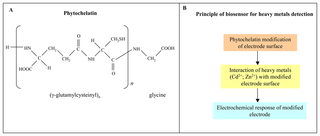 Chemical structure of phytochelatin (A). Scheme of basic principle of biosensor for heavy metals detection (B).