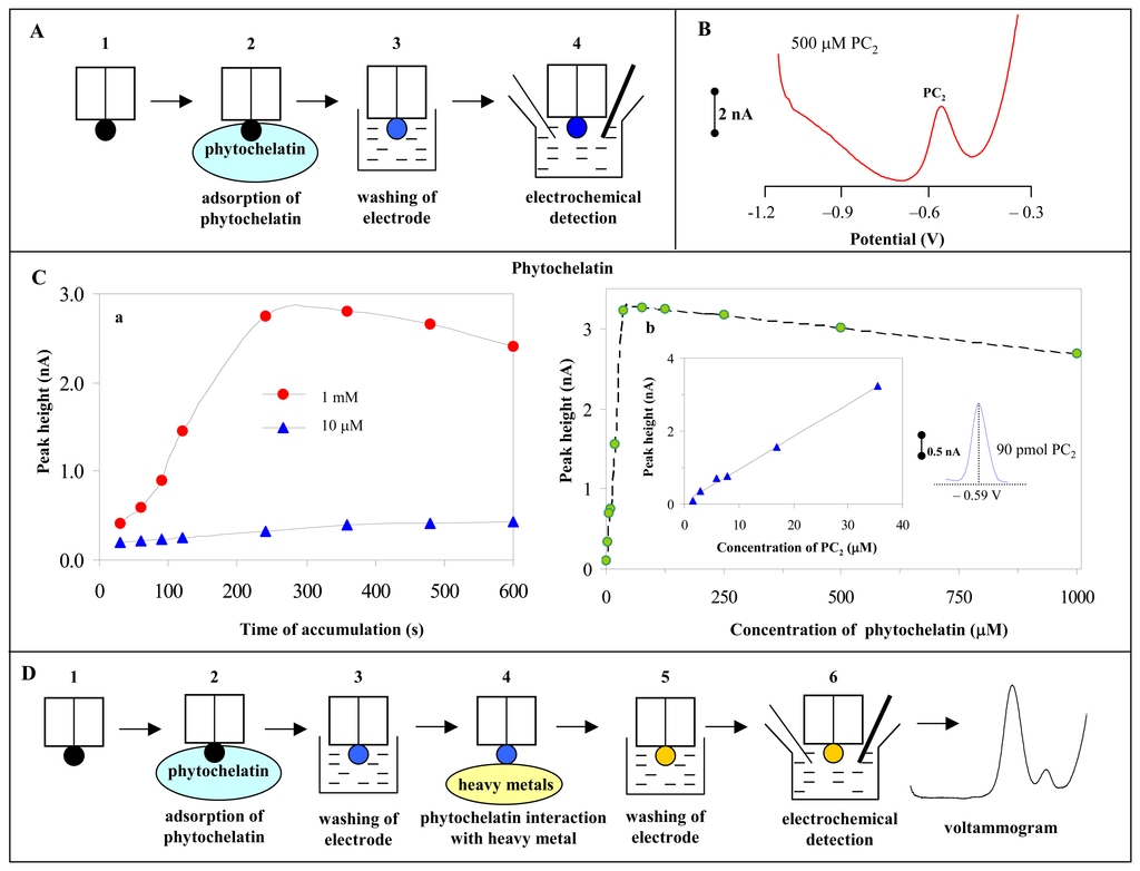 The aim of this paper was to suggest a new heavy metal biosensor based on interaction of heavy metal (cadmium and zinc) with phytochelatin using adsorptive transfer stripping (AdTS) differential pulse voltammetry (DPV). The basic scheme of the proposed heavy metals biosensor is shown in Figure 1B.