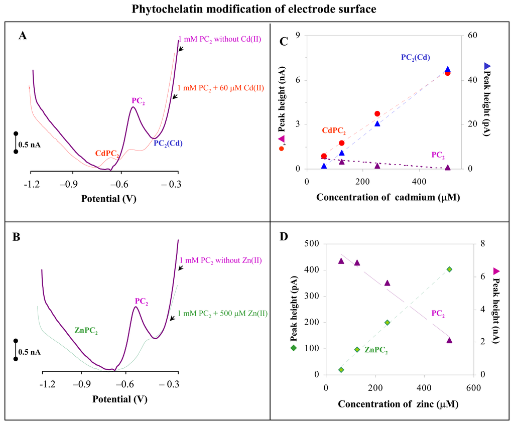 In the case of Zn(II) determination by PC2 modified HMDE, we observed only one additive signal, which was named ZnPC2: –1.09 V, in comparison with control detection of PC2 without interaction with Zn(II). The signal of PC2 linear decreased and ZnPC2 signal linearly increased (y = 0.8496x -18.598, R2 = 0.9961) according to rising Zn(II) concentration. The detection limit (3 S/N) of Zn(II) calculated from increase of ZnPC2 peak was about 13.30 pmole in 5 μl (2.66 μM); see Figure 3D.