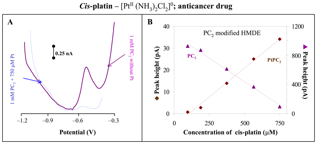 Cis-platin – [PtII (NH3)2Cl2]0; anticancer drug. Typical DPV voltammograms of 1 mM PC2 without addition of cis-platin and 1 mM PC2 + 750 μM of cis-platin (A). DPV parameters: time of accumulation 240 s, time of interaction 300 s. Dependences of PtPC2 and PC2 peak heights on different concentration of cis-platin (B). PC2 concentration: 1 mM. DPV parameters: time of accumulation 240 s, time of interaction 300 s. For other details, see Figure 2.