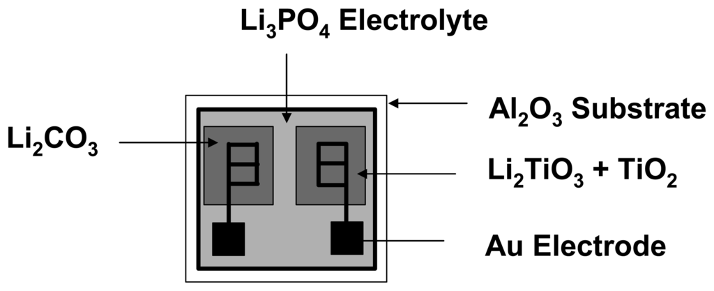Planar type CO2 sensors were fabricated by using thick film process for sensing and reference materials and thin film process for solid electrolytes. Li3PO4 (Aldrich, 99.9%) thin films of 300 nm, 650 nm and 1.2 μm thickness were deposited on Al2O3 substrate by thermal evaporation. During deposition, the applied chamber pressure was 10-6 Torr and power was 10 A. The as-deposited thin films were sintered at 700°C for 2 hr in air. Two Au electrodes were attached to the electrolyte thin films each at 2 mm apart and sintered at 700°C for 1 hr to make good contact with the electrolyte. Li2TiO3 (Aldrich, 99.99%) and TiO2 (Aldrich, 99.9%) were mixed with an organic binder and grinded in a three roll mixer. The paste was screen printed of about 10 μm thicknesses on Au electrode as reference material and sintered at 700°C for 1 hr. In the similar way, Li2CO3 (Alfa Aesar 99.99%) paste was prepared and screen printed as sensing material and sintered at 600°C for 1 hr. The schematic diagram of the fabricated sensor is shown in Fig.1. The overall dimensions of the fabricated sensor was 3mm × 3mm. Li3PO4 electrolyte was deposited over the whole area, though, the dimensions of the screen printed sensing and reference materials were 1mm × 1.5 mm.