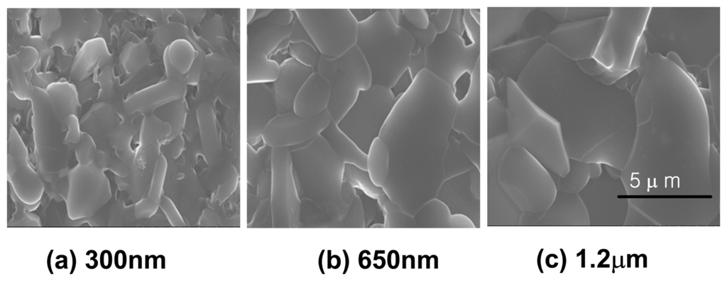 SEM micrographs of the surface morphology of Li3PO4 electrolyte thin films with thickness (a) 300nm, (b) 650nm, and (c) 1.2μm and sintered at 700°C for 30 m in air.