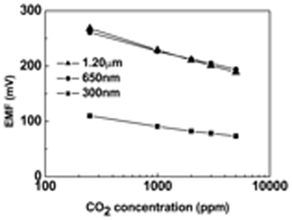 EMF as a function of concentration of CO2 (logPco2) for 300nm, 650nm and 1.2μm thickness deposited electrolyte sensors sintered at 700°C and operated at 500°C temperature.