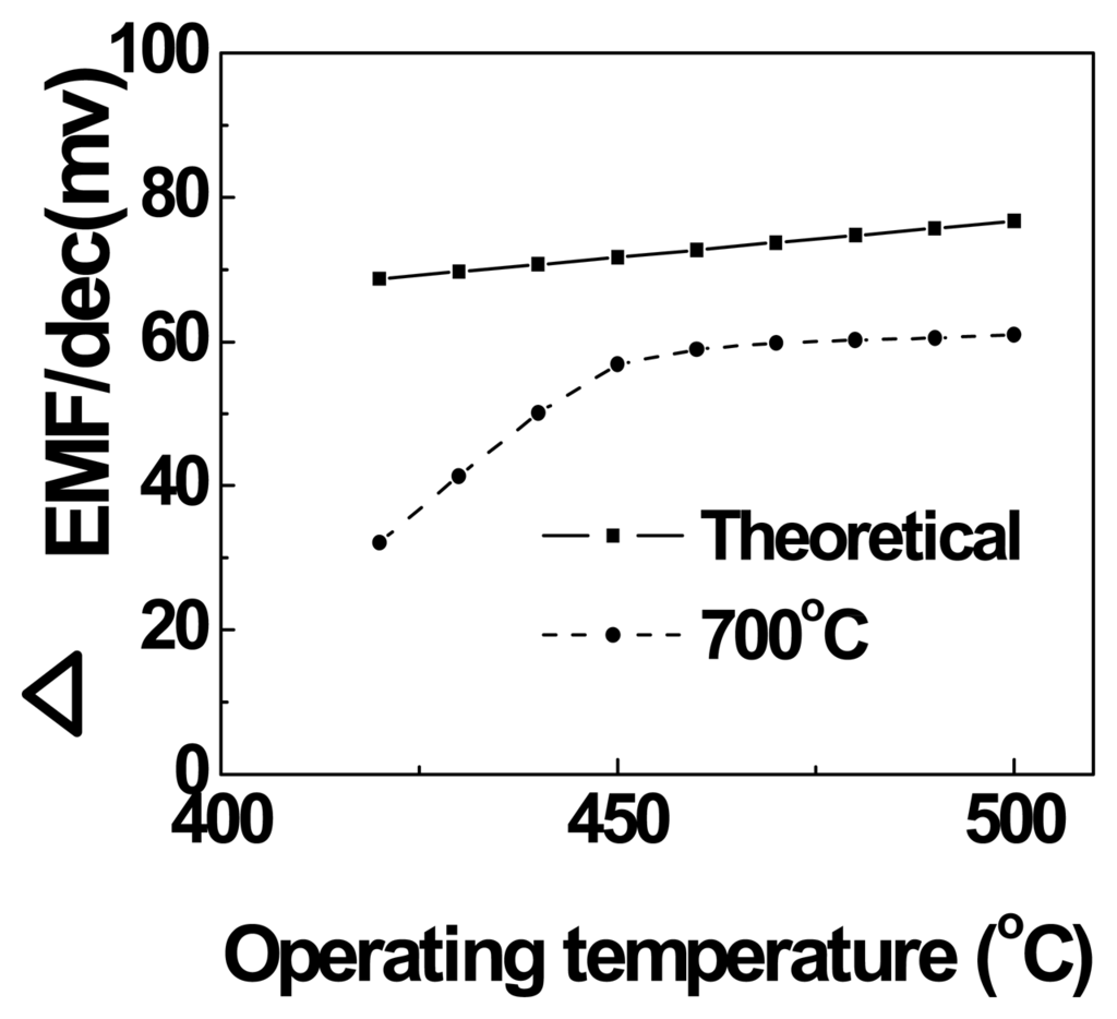 Fig.4 shows the dependence of Δemf/dec as a function of operating temperature for the sensor based on Fig. 2(c). It can be seen from the figure, that the Δemf values were increased up to 460°C operating temperature, and reached a plateau between 460-500°C temperatures. The theoretically calculated Δemf values were showed in the figure as a continuous line. The theoretical value of -76.6 mV/dec was calculated from the equation -2.3(RT/nF), where n equals to 2 representing number of reaction electrons participating in the cell reaction at 500°C operating temperature, R the universal gas constant, T the absolute temperature and F the faraday constant. Between 460-500°C operating temperatures, the experimental values approached about 80% of theoretical value. However, the Δemf values below 460°C operating temperature are very low and much deviated from the theoretical values. This can be attributed to the effect of low kinetic energies produced between each electrode and the electrolyte and reaching a non-equilibrium state [4].