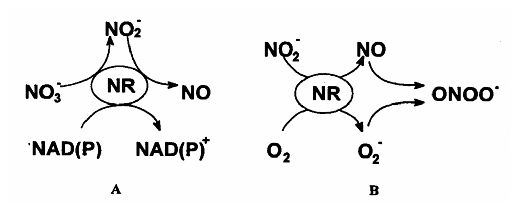 - Yamasaki, H.; Sakihama, Y. Simultaneous production of nitric oxide and peroxynitrite by plant nitrate reductase: in vitro evidence for the NR-dependent formation of active nitrogen species. FEBS Lett. 2000, 468(1), 89–92. [Google Scholar]