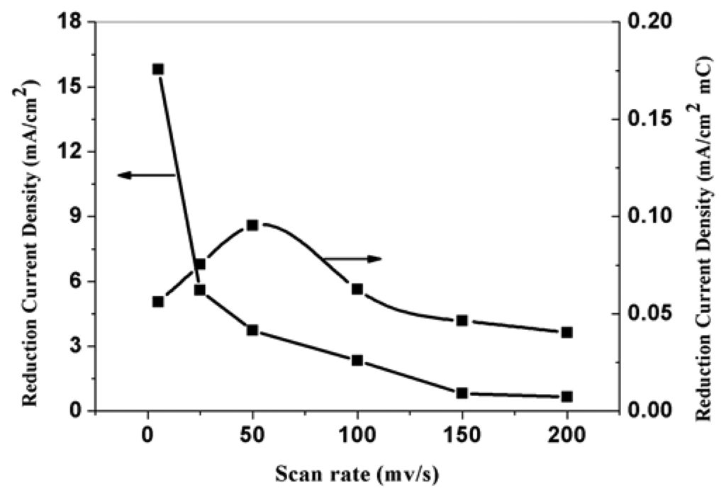 The effect of electropolymerization scan rate on the corresponding electroreduction current density of nitrate at PPy nanowire modified electrode. Electrolyte: 0.5 M H2SO4; 0.015 M NaNO3.
