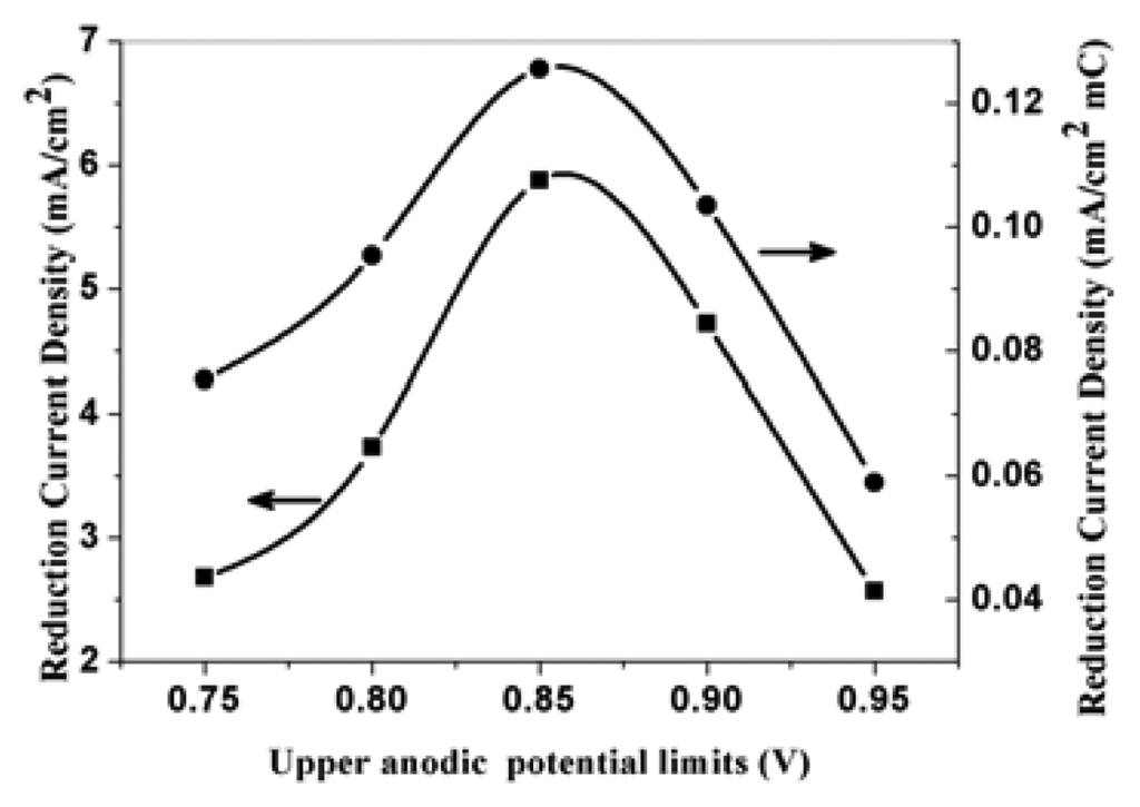 The effect of electropolymerization of upper anodic potential limits (CV) at scan rate of 50 mVs-1 on the corresponding electroreduction current density of nitrate at PPy nanowire modified electrode. Electrolyte: 0.5 M H2SO4; 0.015 M NaNO3.