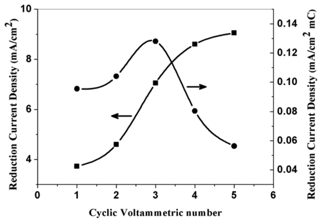The effect of electropolymerization CV number at scan rate of 50 mVs-1 on the corresponding electroreduction current density of nitrate at PPy nanowire modified electrode. Electrolyte: 0.5 M H2SO4; 0.015 M NaNO3.