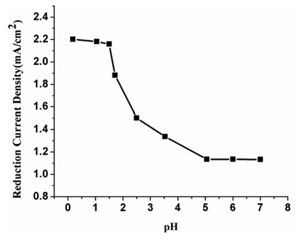 The effect of pH on the response of NO3- at the modified electrode was investigated with pH at 0.5, 1.0, 1.5, 1.7, 2.5, 3.5, 5, 6 and 7.0, respectively. Figure 13 is the relationship between electroreduction current density and pH. The figure shows that the electroreduction current density of nitrate increases with the decreasing pH value until it reaches about 1.5. Further decrease the solution pH, the reduction currents has no obviously change. Therefore, the determination of NO3- was conducted under pH in the range of 0.5∼1.5.