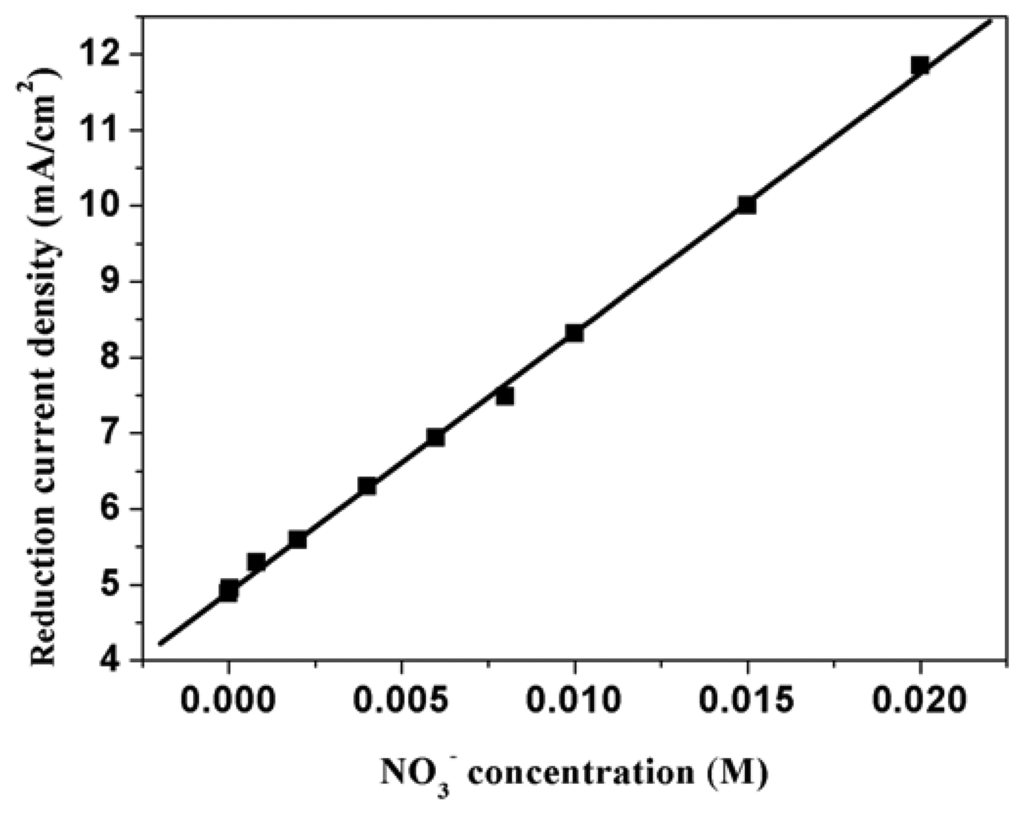Relationship between electroreduction current density and nitrate ion concentration at PPy nanowire modified electrode. Supporting electrolyte: 0.50 M H2SO4.