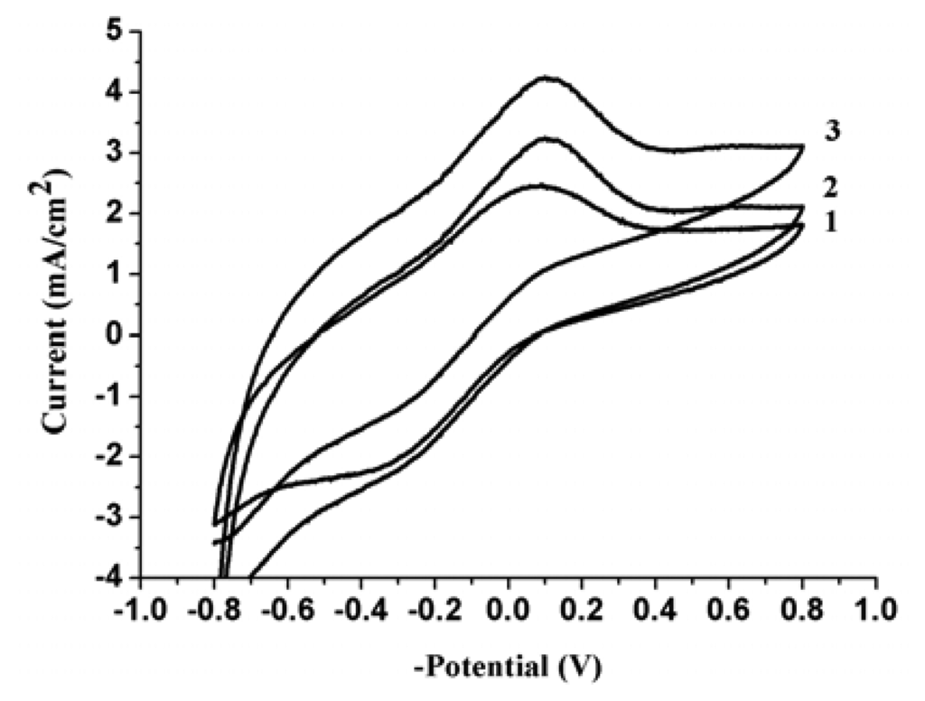The effect of upper anodic potential limits of cyclic voltammetric polymerization and the effect of scan number of cyclic voltammetric polymerization on the electroreduction current density is also studied. Figure 11 and figure 12 respectively show the corresponding electroreduction current density of nitrate at the PPy nanowire modified electrodes. Figure 11 shows the electroreduction current density reaches the maximum when the polymerization potential is 0.85 V. The reason is just as above mentioned. Figure 12 indicates that the electroreduction current densities at the modified electrodes increase with the increase of cyclic voltammetric scan number in polymerization process. When the polymerization charge is too large, the increase degree of the current density is getting less with the increase of polymerization charge. This result demonstrates that the increase degree of effective surface area of modified electrode is more significantly for a thin PPy film than that of thick film. When the polymerization charge is higher than a certain values, the effective surface area will no obviously increase.