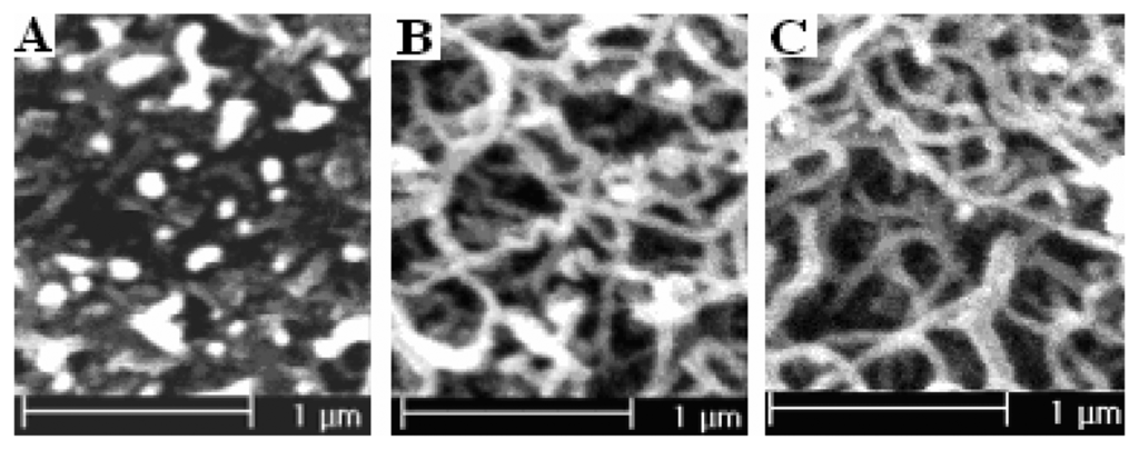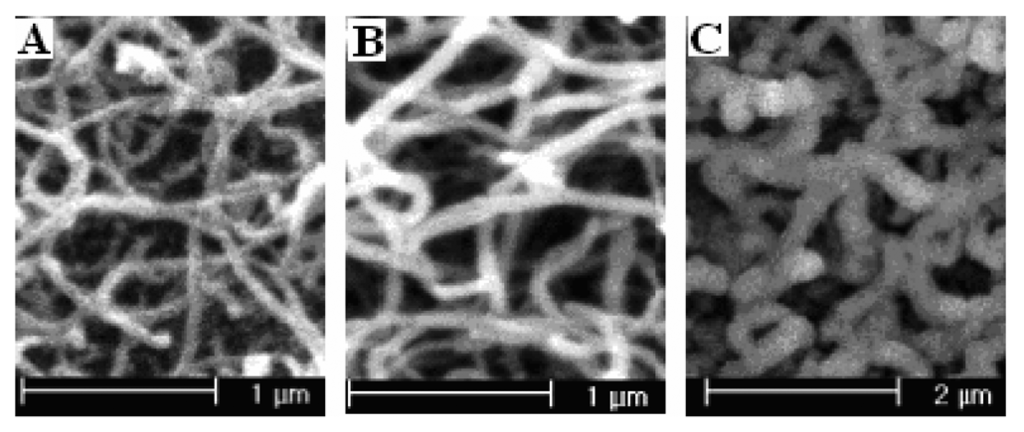 The SEM pictures of polypyrrole nanowires prepared potentiostatically at different potentials (A) at 0.75 V; polymerization charge 81.58 mC; (B) at 0.85 V; polymerization charge 144.95 mC; (C) at 0.95 V; polymerization charge 191.56 mC.