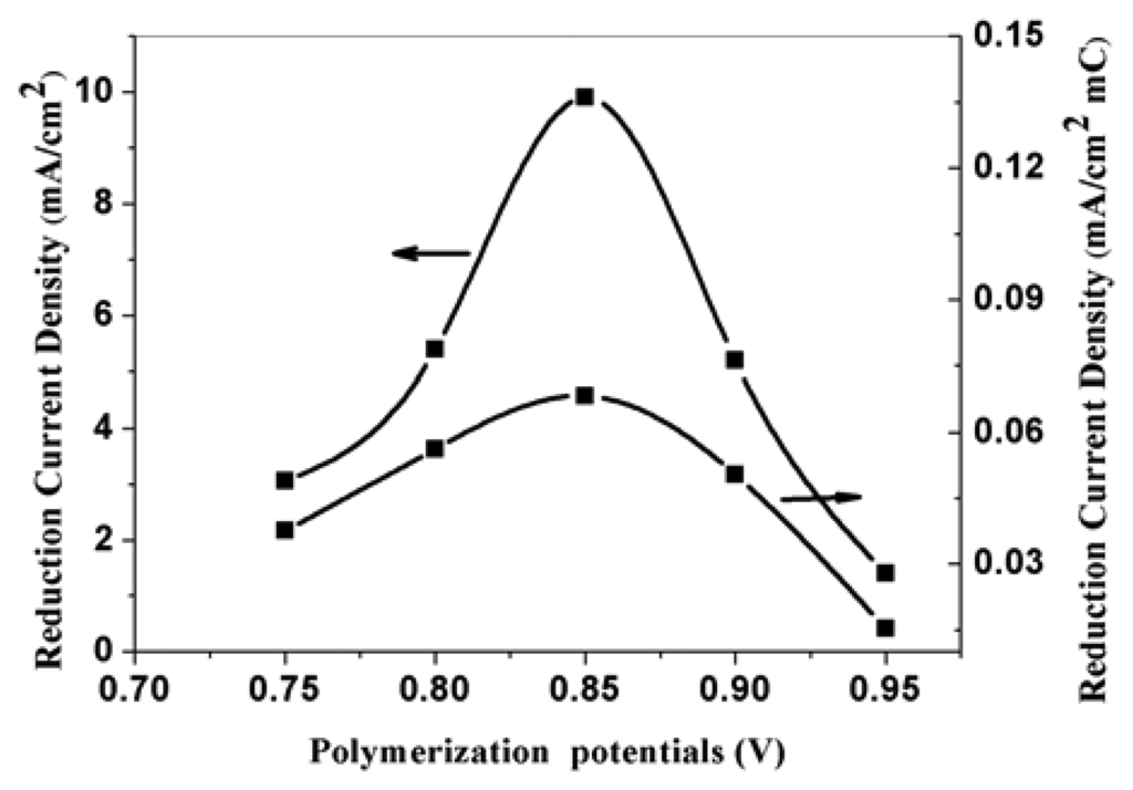 The effect of polymerization potential on the corresponding electroreduction current density of nitrate at PPy nanowire modified electrode. Electrolyte: 0.5 M H2SO4; nitrate concentration: 0.015 M.