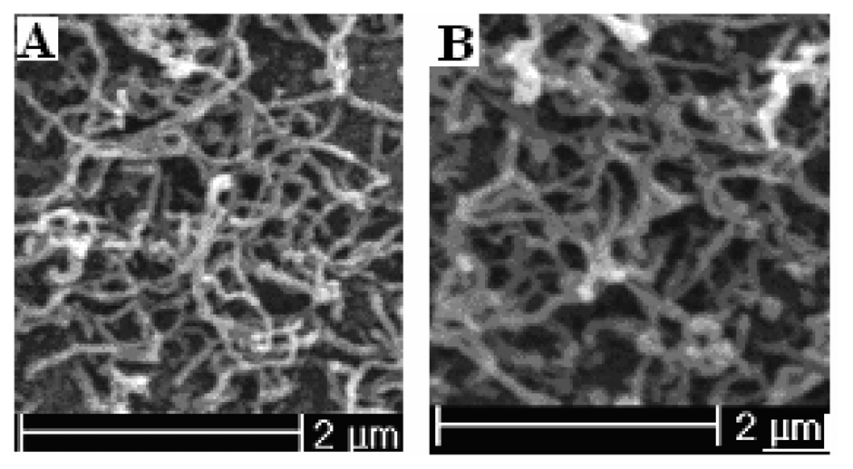 The SEM pictures of polypyrrole nanowires prepared potentiostatically at 0.85 V for 150-second at different temperature. (A) 283.15 K; polymerization charge 48.58 mC; (B) 293.15 K; polymerization charge 90.26 mC.