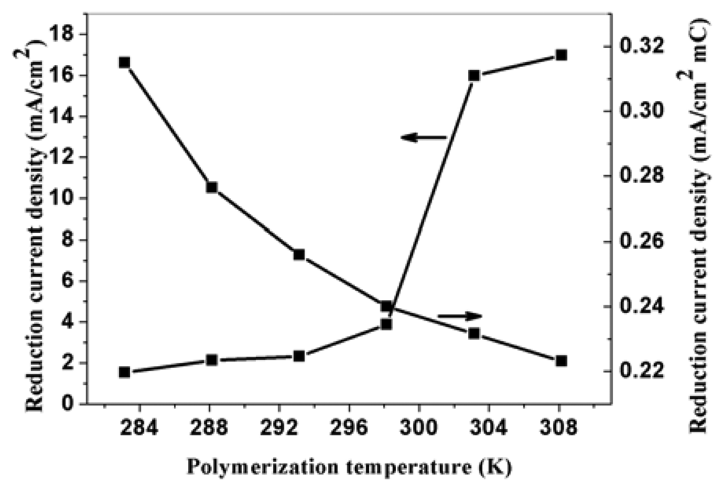 Temperature has a significant effect on the polymerization rate of PPy. The higher the polymerization temperature is, the higher the polymerization rate, and thus the higher surface area electrode obtained. Figure 5 is the SEM pictures of PPy nanowires obtained at 283.15 K and 293.15 K potentiostatically under potential of 0.85 V vs SCE for 100-second. From the picture, we can know that the length of nanowires increases with the increase of the polymerization temperature, but the diameters have no obvious change. Figure 6 is the relationship between the polymerization temperature and the reduction current density of nitrate ions. As can be seen, the electroreduction current density for a unite polymerization charge at the modified electrode decreases with the increase of polymerization temperature. This is mainly attributed to the conductivity reduction of PPy prepared at higher temperature. Electroreduction current density for total charge increases with the increase of polymerization temperature. This is due to the increase of the effective surface of nanowires modified prepared at higher temperature. Under the same polymerization time, the polymerization charge increases with the increase of the temperature, which causes the increase of electroreduction current density of total charge. When the temperature is low, the polymerization reaction rate is very slow. So the suitable temperature to polymerize pyrrole is about 288.15 K. These results indicate that the corresponding reduction current density is also related to the conductivity of the modified PPy nanowires.