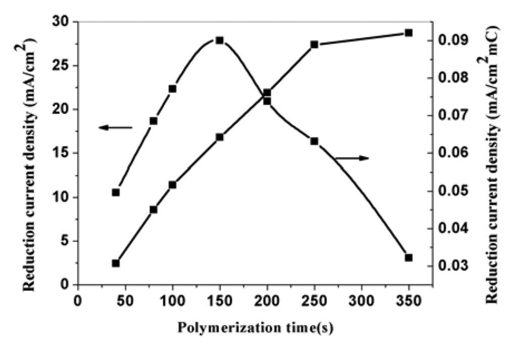 Varying the polymerization time can effectively control the polymerization charge. At the same polymerization potential, the longer the polymerization time is, the more polymerization charge passes. Figure 7 is the SEM pictures of PPy nanowires prepared potentiostatically under potential of 0.85 V vs SCE with 40-second, 150-second, 350-second. The pictures clearly show that the diameters of the formed PPy nanowires almost have no change with the increase of polymerization time, but the length of nanowires increases. Figure 8 is the effect of polymerization time on the corresponding electroreduction current density. The corresponding currents of the electrodes indicate that the current density increases with the increase of polymerization time. The reason is that the effective area of the modified electrodes increases. The curve about corresponding current density for a unit charge in the figure shows that the current density firstly increases with the increase of polymerization time and then decreases when the time exceeds 150-second. This is due to the increase of effective surface for a unit charge at first, but when the polymerization time exceeds 150-second, the diffusion resistance increases with the increase of the thickness of film and the effective surface does not change obviously with the increase of polymerization time. In addition, the film is not well–adhered to the electrode surface when the film is too thick. So the suitable polymerization time to prepared modified electrode is 150-second ∼250-second.