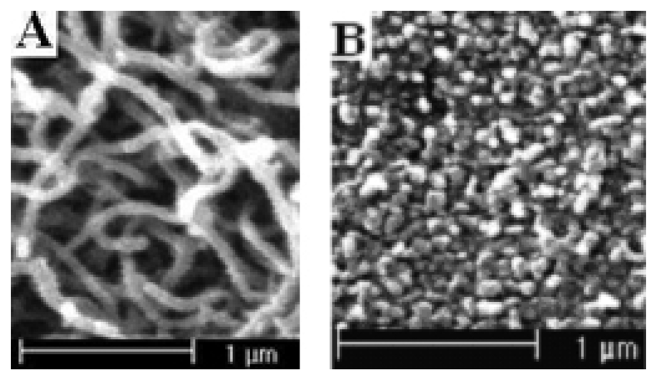 SEM pictures of polypyrrole modified electrode surface. (A: Nanowires; B: cauliflower).