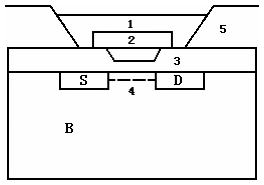 Structure of ISFET. S: source; D: drain; B: p-silicon; 1- drug sensitive membrane; 2 - Si3N4; 3 - SiO2; 4 - n-channel; 5 - silicone rubber.