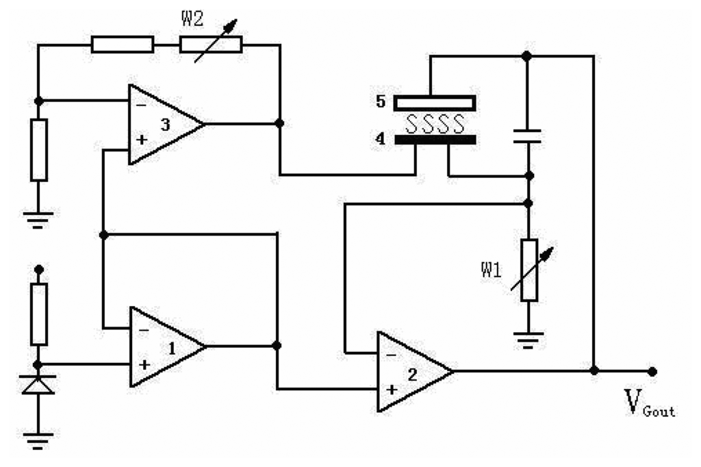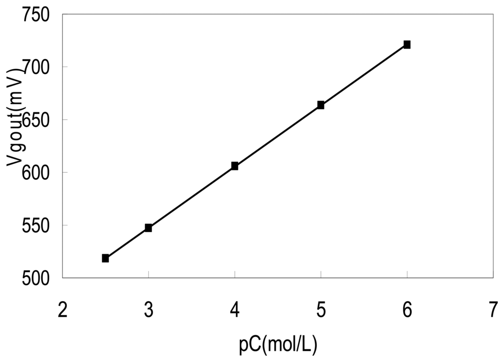 During the determination, the ISFET and reference electrode (Type-217 mercurous chloride electrode) formed a measuring current loop. An Operational amplifier was used to bring a stable criterion voltage. The operating state (VDS, IDS) of ISFET was calibrated by adjusting W1 and W2. When the concentration of solution varied, the VGout also altered. The relative curve of VGout versus–log C (C was the concentration of solution to be determined) could be obtained according to the experimental results. The determination principle of atropine ISFET sensor is shown in Figure 2.