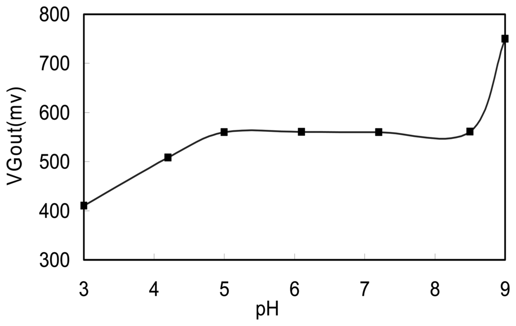 If the current IDS and voltage VDS between drain (D) and source (S) are kept constant, the voltage of gate (G) VGout varies with the change of the component concentrations to be determined. The relationship between them is in accordance with the Nernst formula as shown below: