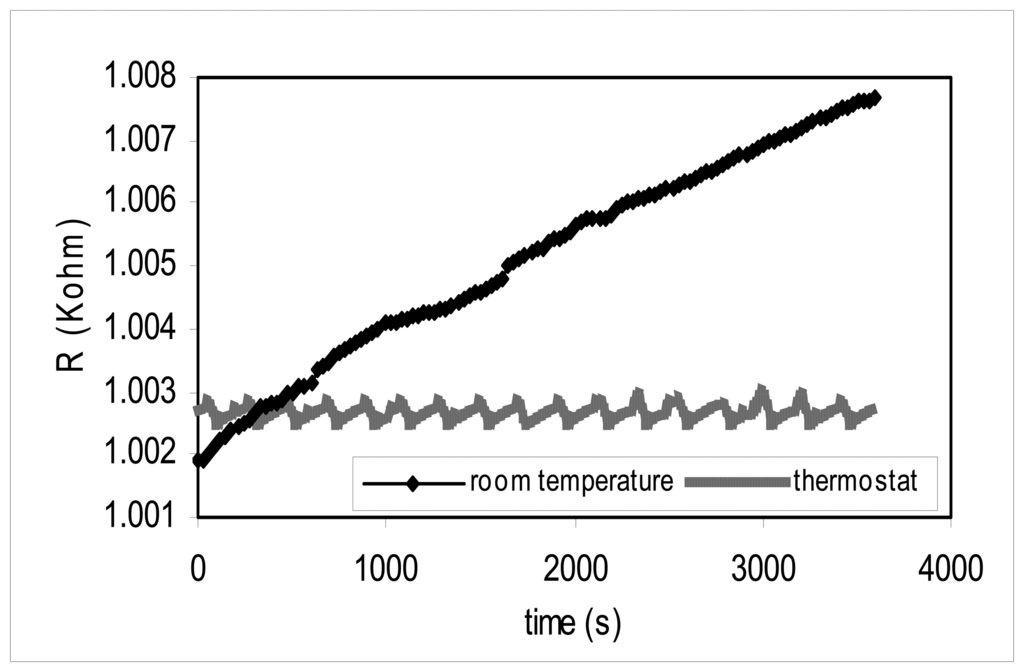 Distilled water (40 mL) is placed inside the cell, at a temperature close but above 25 °C, to establish the change that is produced in the system temperature at a specific time. Readings of outgoing electric resistance of the thermistor in function to time are made for 60 minutes periods, with recordings of resistance readings every 20 minutes, in order to observe the continuous change in the electric resistance of the thermistor and the insulation of the cell-water system. Resistance curves in function to time are determined, with the calorimetric set kept at room temperature and with temperature control inside the thermostat.