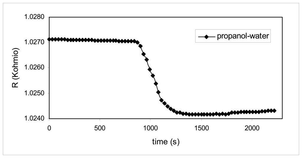 Once the characteristics of the calorimetric cell are known, the determinations of the heat solution are made for a system in liquid phase, propanol-water and for a solid liquid KCl-water system. Water (40 mL) is placed in the cell and in the glass ampoule an amount of the solute is weighed with a precision of 0.001 g; the cell is assembled and is thermally equilibrated in a thermostat at 25 ± 0.1 °C, for approximately one hour. When the variation in the outgoing electric resistance of the thermistor is constant, its readings are started for a pre-period between 10 and 15 minutes, with resistance readings every 20 seconds; then the mixture of the solvent, water, and the solute is made, the resistance readings are continued until they become constant and finally it is calibrated electrically.