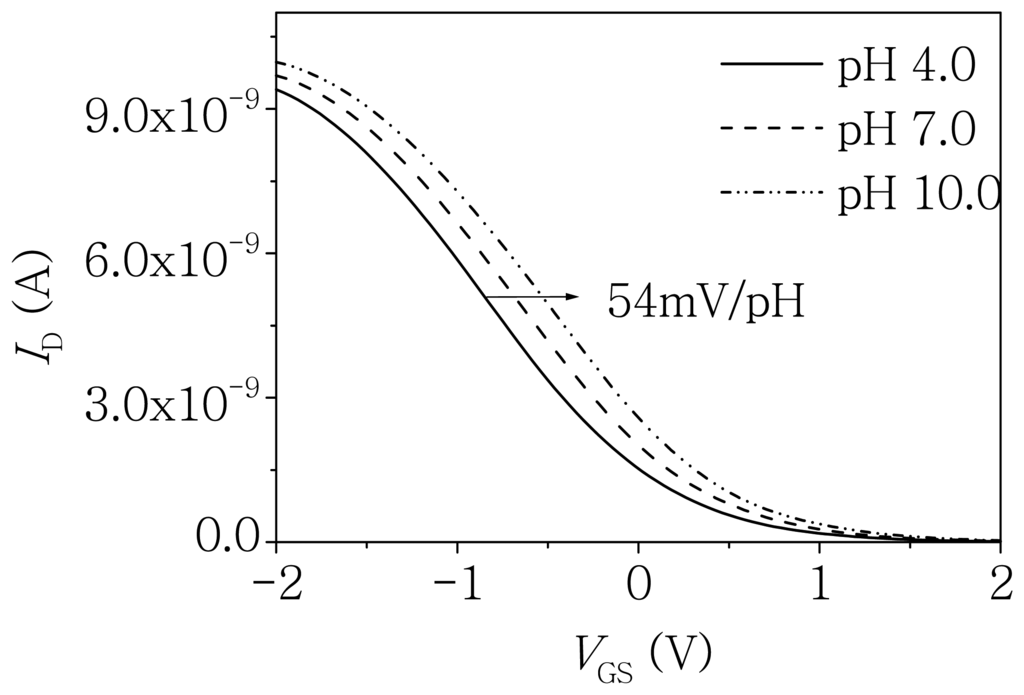 ID-VGS curve of a p-type ISFET with transistor size W/L = 20 μm/6 μm measured with VDS = 0.1 V in phosphate buffer with different pH values.