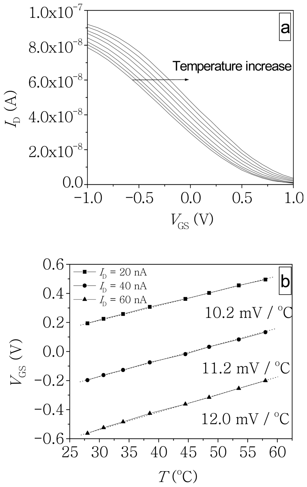 a) ID-VGS curve of a p-type ISFET with transistor size W/L = 100 μm/6 μm measured with VDS = 0.1 V in a 5 mM phosphate buffer pH 7.6 at different temperatures. The temperatures corresponding to the curves from left to right are 28.0oC, 30.7oC, 34.0oC, 38.5oC, 44.5oC, 48.5oC, 53.5oC and 58.0oC, respectively; b) temperature dependence of the gate voltage corresponding to different values of ID.